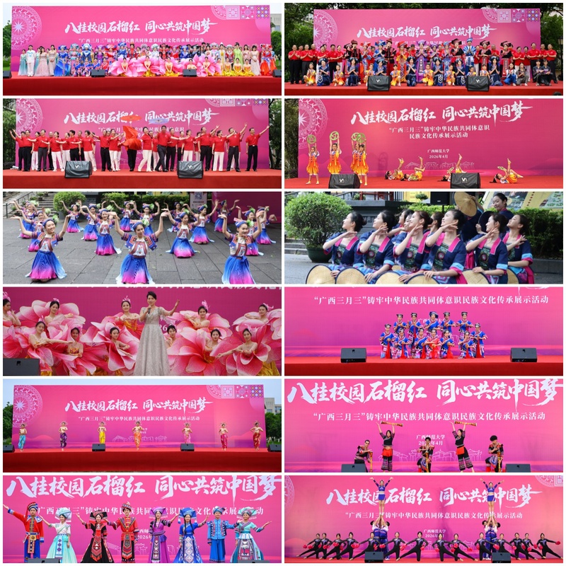 春拂八桂,歌满漓畔;石榴花开,籽籽同心。4月15日,由广西师范大学主办的2026年广西三月三铸牢中华民族共同体意识民族文化传承展示活动,在雁山校区孔子广场、育才校区中华传统文化名人园、王城校区正门同步拉开帷幕。 活动以“八桂校园石榴红,同心共筑中国梦”为主题,近万名中外师生、离退休教师、附属中小学幼儿园学生、社区市民及中外游客齐聚一堂,共同沉浸于这场跨越年龄与国界的民族文化盛宴。