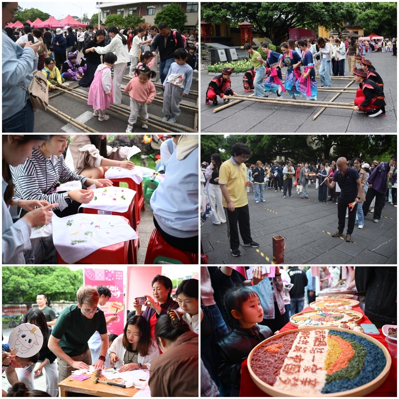 民族美食品鉴区香气蒸腾,五色糯米饭如彩虹落盘,艾叶粑软糯清甜,油茶醇厚回甘。师生与游客在舌尖上品味壮乡山水,在烟火气中感受民族智慧。育才校区分会场特别设置“五谷分拣速挑战”、茶俗拼图、竹竿舞、彩绘蛋等亲子互动项目,许多教职工、周边社区居民携子女一同体验,大手握小手,在彩蛋上描绘铜鼓纹样,在竹竿开合间踏出童年节拍。王城校区则依托古城文韵,抛绣球、竹竿舞、糯米饭“寻味”等活动让历史与当下温柔相拥。