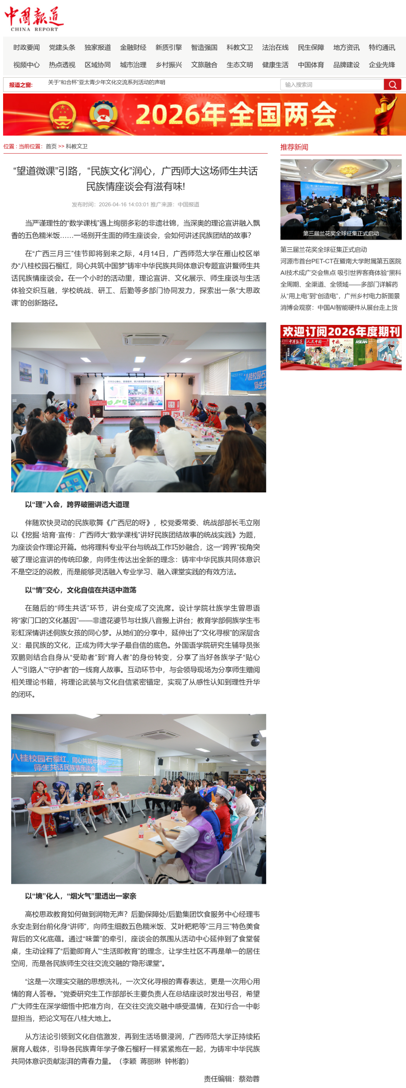 4月16日,中国报道刊发题为《“望道微课”引路,“民族文化”润心,广西师大这场师生共话民族情座谈会有滋有味!》的报道,聚焦我校4月14日在雁山校区举办的“八桂校园石榴红,同心共筑中国梦”铸牢中华民族共同体意识专题宣讲暨师生共话民族情座谈会。此次活动将理论宣讲、文化展示、师生座谈与生活体验有机融合,引导各族师生在文化浸润与交流交融中坚定文化自信、厚植家国情怀,持续推动中华民族共同体意识入脑入心。